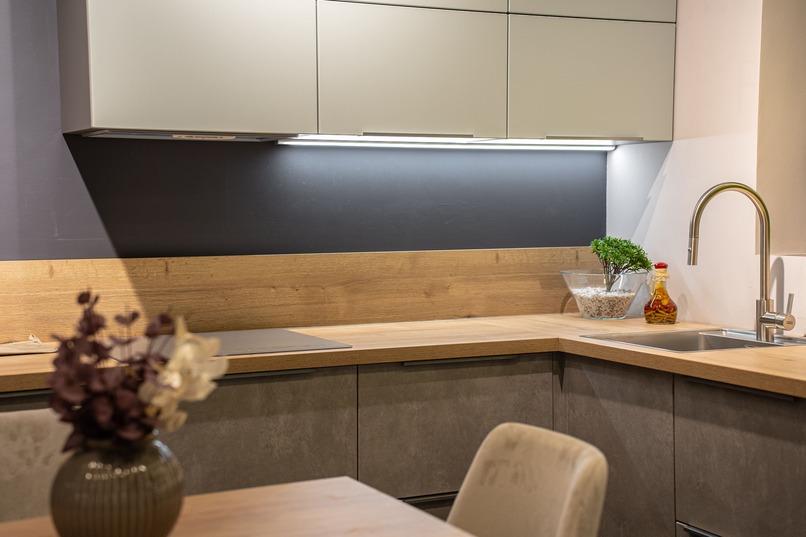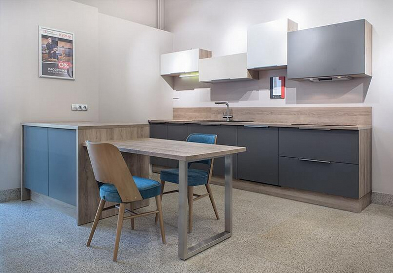 The DUET kitchen is made of MDF.MDF (medium-density fiberboard) is a wood fiber board manufactured using a hot-pressing process. In appearance and properties, MDF boards are virtually identical to natural wood, while surpassing it in strength and moisture resistance. An environmentally friendly material.Read more16 or 19 mm thick, Austrian brand Egger, environmental safety class E1. The facade surface is covered with PVC film.PVC: Polyvinyl chloride film is a polymer cladding material resistant to household chemicals and environmentally safe.Read moreat the buyer’s choice – plain or textured, including soft-touchSoft-touch is a matte coating created using PVC films with a velvety texture.Read moreTextures can be arranged vertically or horizontally. Designers recommend using contrasting color combinations in this model.