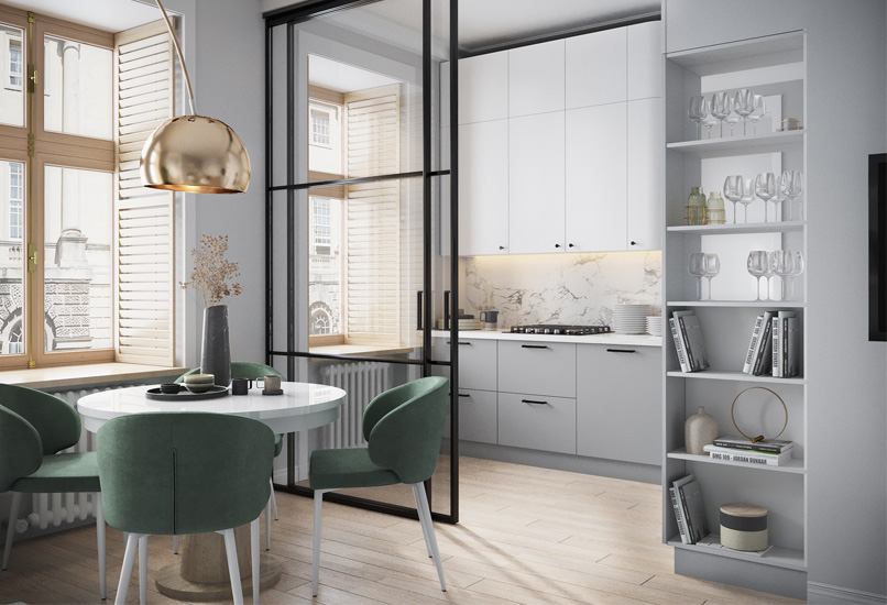 The DUET kitchen can be designed in any layout—straight, corner, U-shaped, with a kitchen island or peninsula. Thanks to its curved fronts, this model looks great in larger spaces as a freestanding unit. We can also install the DUET model into a niche or construct a mezzanine.A mezzanine is a wall-mounted unit located above the upper kitchen units and/or above the refrigerator. The depth of the mezzanine is equal to the depth of the lower units.Read moreabove the upper cabinets to make the most of the available space.