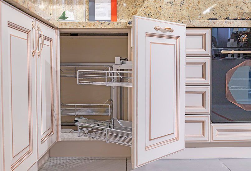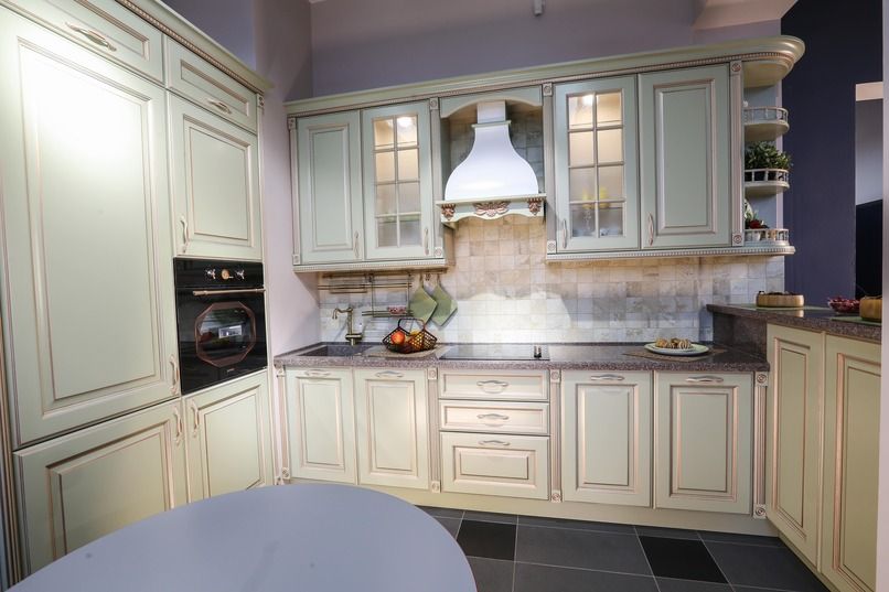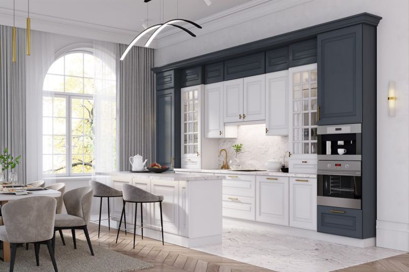 The MILADY kitchen has curved fronts.A radius facade is a rounded facade, either convex or concave.Read more, which can be used to decorate side cabinets or a kitchen island. Both straight and curved fronts can be glazed, including with a glazing bar, or finished with a decorative grille, adding a special charm to your kitchen. BalustradesA balustrade is a decorative shelf railing consisting of shaped columns connected by railings.Read moreand pilastersA pilaster is a decorative element of furniture, a vertical overlay with a three-dimensional pattern.Read moreserve as additional decoration for open shelves and cabinets.